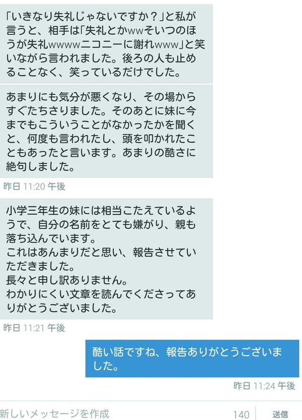 会話していると「にこ」という名前に反応したラブライバーが「にこ」という名前の女児に「改名した方がいい、顔に合ってない。」といきなり暴言を吐いたという。