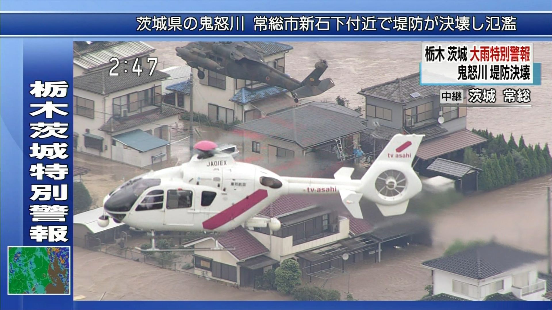 9月10日日本テレビ系「情報ライブ ミヤネ屋」で栃木県と茨城県を流れる鬼怒川が氾濫し、自衛隊が救助活動する現場を報道。