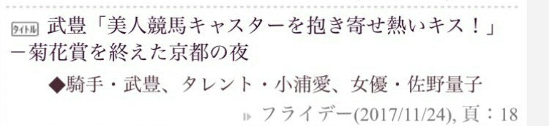 天才ジョッキー武豊騎手と18歳年下のキャスター小浦愛とのキス抱擁写真がフライデーされた。