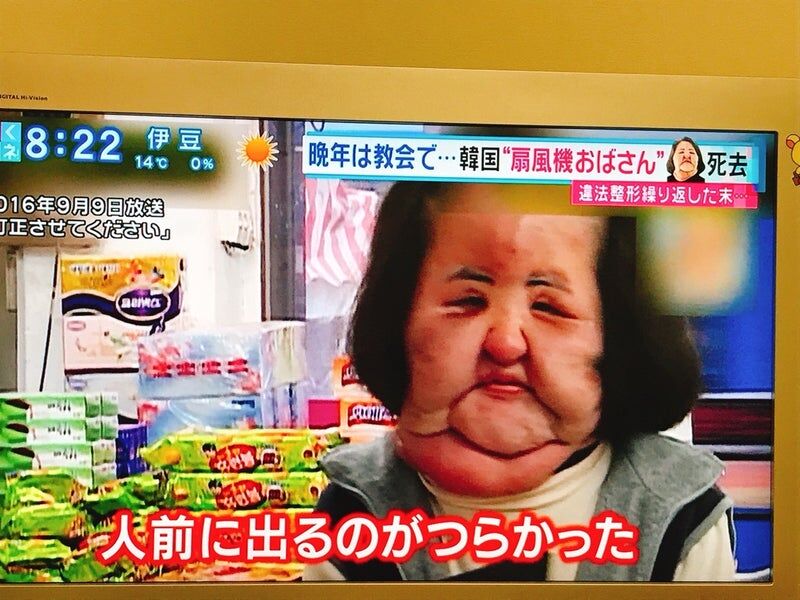 扇風機おばさんとは。整形依存によって顔面が肥大し、その見た目から「扇風機おばさん」と呼ばれていた韓国のハン・ヘギョンさんの俗称。