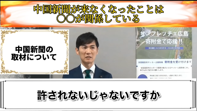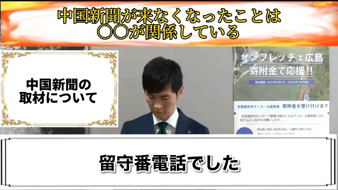 これを地方自治法に照らし「石丸市長が議会軽視した」と中国新聞の胡子記者が記事にしたので、それの説明を求めることがきっかけとなった。偏向報道を切り捨てられてもまともな説明ができない胡子記者に関する動画が何本も100万回以上再生された結果、大炎上する流れとなった。