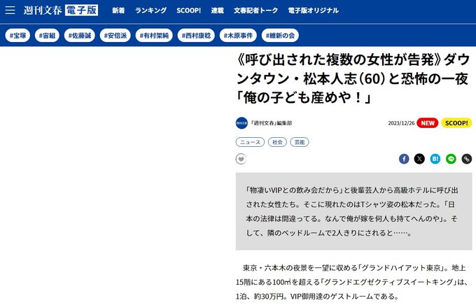 12月24日放送「M-1グランプリ」の審査員長をつとめるなど、日本の芸能界のトップに君臨するダウンタウンの松本人志(60)。その松本が六本木の超高級ホテルのスイートルームにて飲み会を開催。後輩芸人に女性を集めさせ、「ゲーム」と称し、いきなりキスをしたり、「俺の子ども産めや!」などと性行為を迫っていたりした事実が「 週刊文春 」の取材で分かった。
