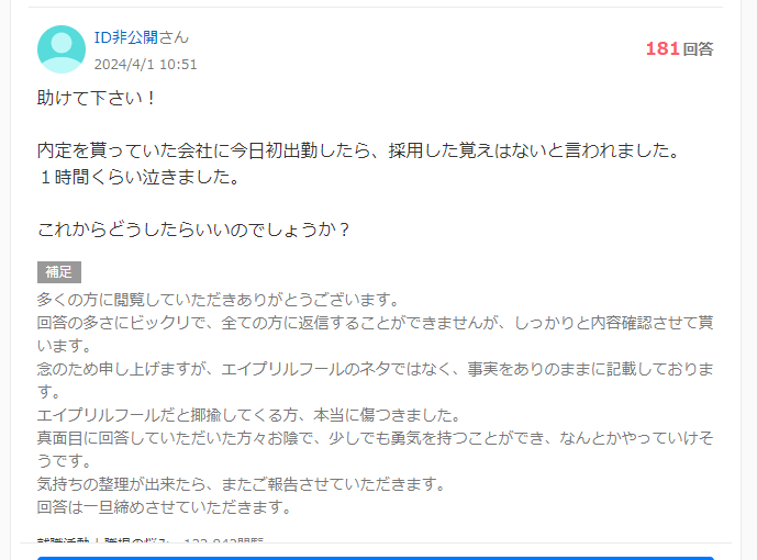 質問者がどのような内定のもらい方をしたのか、詳しく説明されていないが、これらの回答に「エイプリルフールだと揶揄してくる方、本当に傷つきました。真面目に回答していただいた方々お陰で、少しでも勇気を持つことができ、なんとかやっていけそうです。」と自身の中で整理をつけ、「またご報告させていただきます。 回答は一旦締めさせていただきます。」と質問の受付を終了。