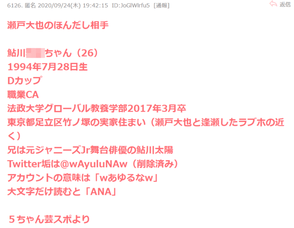 瀬戸大也の浮気相手は鮎川太陽の妹で写真画像から元ジャニーズツイッターのCAルナと特定 2020年09月25日 カテゴリ:スキャンダル 9月24日、東京五輪日本代表に内定している瀬戸大也の不倫を「週刊新潮」が報じたことで、その相手の女性が話題になっている。瀬戸大也の不倫報道は、ネットでは大変なことになっているが、テレビの情報番組では、全くと言っていいほど取り上げていない。不倫は不貞行為であるものの、基本当事者の問題なので、テレビで大騒ぎする必要はない。 しかし、過去には東出、渡部ほか芸能人だけでなく、著名人の不倫は、情報番組で連日報道し、司会者・コメンテーター達が寄ってたかって、立ち直れないくらい、ボコボコに批難報道してきた経緯がある。なのに今回は、全くと言っていいほど報道されていない。なぜ、瀬戸大也の不倫は報道されないのか?今回は相手の女性、元ジャニーズ Jrの鮎川太陽の妹というルナについてまとめてみた。 ■目次・瀬戸大也の不倫報道 ・瀬戸大也の不倫相手は誰? ・鮎川太陽の不倫相手がメディアで報じられない理由 ・瀬戸大也の今後 瀬戸大也の不倫報道 記事内容9月24日、東京五輪競泳男子の日本代表に内定している瀬戸大也選手が、マネジメント会社のHP上で謝罪文を掲載した。“不倫”疑惑を報じた『週刊新潮』10月1日号を受けてのものだった。同誌では、瀬戸選手の妻で、飛び込み競技の元日本代表だった馬淵優佳さんが留守にしているあいだの“情事”の一部始終が書かれている。 「子どもたち2人が保育園に預けられているあいだ、瀬戸選手は20代半ばのCA女性を高級外国車で迎え、ホテルで過ごしていたというのです。不倫相手との約1時間半の逢瀬を終えると、自宅に戻り、わざわざ国産車に乗りかえて保育園のお迎えに出向き、娘たちと帰宅する姿など一連の様子が撮られていました」(スポーツ紙記者) 当然ながら、妻の優佳さんは怒りに震えていることだろうが、冒頭の夫とともに《今後、どのような形で皆様の信頼を回復していくことができるか》と、連名で直筆の謝罪文を寄せたのだった。 「瀬戸選手はそれこそ“土下座”をする勢いで状況説明し、謝罪したと言います。おそらくは“遊び”“本気ではない”とでも釈明したのでしょう。実際、彼は子どもにとって良き父親であることから、今回ばかりは優佳さんも許したのでは?」(前出・スポーツ紙記者) 不倫相手の“裏アカ” 隠しきれぬ思い 確かに、彼の不貞行為が“本気”でないと見られるのは、密会場所に選んだのが都心の高級ホテル、ではなく、決してきれいとは言えない激安ホテルだったからだ。 一方の“CA女性”もまた、“遊ばれている”ことを感じとっていたのだろう。『新潮』ではこの女性が《今更ながらこの関係ゲロ吐きそう》《ちょー純粋な彼氏ほしいな 疲れたわ》と、不倫を匂わせるような、それでいて罪悪感にさいなまれているような発言をSNS上で吐露しているとも。同誌が実家を取材で訪ねると、すぐさまアカウントは非公開になったようだ。 「都内の有名私立大学に在籍していた時から人目を引く美人さんだったそう。というのも、彼女のお兄さんは元ジャニーズで、Jr.ユニットの一員として人気を博し、有名ドラマにも出演していたほどのイケメン。現在は舞台を中心に活躍して、彼女も《兄の舞台いついく》との母親とのやりとりを明かしていました」(芸能リポーター) そんな彼女のものと見られる“裏アカ”には、瀬戸選手との不適切な関係からか、次第に心が不安定になっていく様子が書かれていた。 「昨年には《一睡もできなかった…はやく仕事おわれ、、気持ち悪い》《女の勘きたんだコレッ!!だから嫌なんだよ》と、感情を吐き出すようなツイートを繰り返し、今年に入っても《やばい。ねれない》《ショックや》と綴っています。一方で友人の結婚を明るく祝福するなど、やはり報われない“恋愛”に悩んでいたのではないでしょうか。 多くの女性にとっては憧れの花形職業に就き、明るいものだった彼女の人生は、瀬戸選手と出会ってしまったことで大きく変わってしまったのかもしれません」(前出・芸能リポーター) 1番の被害者はもちろん、妻の優佳さんだ。しかし、この女性もまた瀬戸選手の身勝手な“遊び”の被害者なのかもしれない。女性自身 ▲目次にもどる 瀬戸大也の不倫相手は誰? 瀬戸大也選手の不倫相手はCAだということは週刊誌に報じられているが、、ネット情報では瀬戸のスポンサーであるANAのCA。すでにこの不倫相手のツイッターアカウントが特定されており、名前はルナで26歳「ルナ@wAyuluNAw」 このアカウントを調べていくと、元ジャニーズ Jrの鮎川太陽の妹ということが判明した。鮎川太陽は、ジャニーズJr.で結成されたグループユニット「Ya-Ya-yah」の元メンバー。現在は退所しており、株式会社S所属の俳優として活動している。 2004年、『3年B組金八先生』第7シリーズや黒子のバスケなどに出演していた際、「ルナ@wAyu
