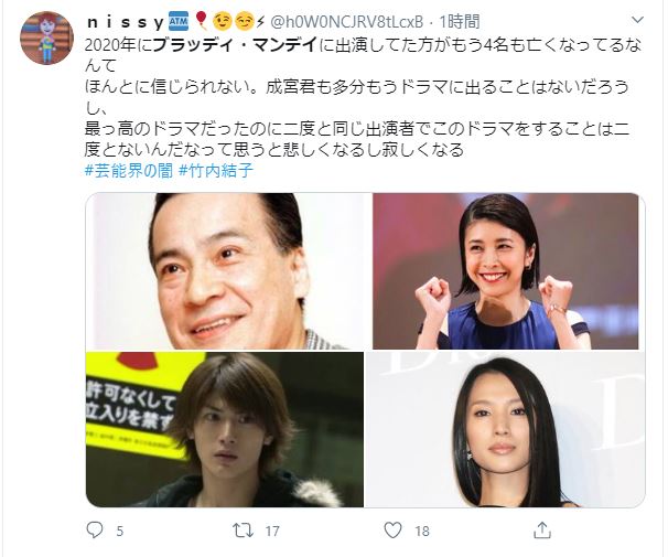 竹内結子の他殺の可能性5chの犯人検証や三浦春馬との関係がやばい 2020年09月29日 カテゴリ:スキャンダル 三浦春馬、芦屋星に続き、竹内結子と本当に素晴らしいタレントの共感自〇が止まらない。過去にもドミノ倒しのように坂井泉水から始まり、飯島愛、川田亜子、上原美優、松岡大臣、永田議員、三宅雪子などこんな素晴らしい方々が、なぜこんな追い詰められて悲惨な事になってしまったのか?竹内結子は変〇にあたるのだが、警察は自〇と断定している。ただ、警察がどう判断するかは誰も関われないし、その過程もわからない事。 今回は、5chで噂になっている竹内結子の他殺の可能性についてまとめてみた。 ■目次・竹内結子とは ・竹内結子の自〇報道 ・竹内結子は自〇ではない? ・竹内結子の他殺説 竹内結子とは 竹内 結子生年月日1980年4月1日 (没年月日2020年9月27日)出身 埼玉県浦和市所属「スターダストプロモーション」夫は俳優の中林大樹。1996年(平成8年)、堂本光一主演のテレビドラマ 『新・木曜の怪談 Cyborg』(フジテレビ)での快活なヒロイン役女子高生としての全話出演で女優デビュー。 その後は数々のドラマや映画などに出演、1999年(平成11年)に放送されたNHK連続テレビ小説 『あすか』、2001年(平成13年)に放送されたテレビドラマ 『白い影』(TBS)ではそれぞれヒロイン役を務め、広く知られるようになった[1]。その翌年に放送されたテレビドラマ 『ランチの女王』では、フジテレビ月曜9時枠の連続ドラマ(月9)に初主演した。 2005年6月、映画『いま、会いにゆきます』で共演した中村獅童と結婚。妊娠していることも公表し、同年11月に第1子となる男児を出産(2008年2月に離婚。親権は竹内)。2019年2月27日、所属事務所の後輩の中林大樹と再婚、連名で報告した。 2019年8月28日、第二子を妊娠していることがわかった。翌年1月末に男児を出産。2020年(令和2年)9月27日午前2時ごろ、夫の中林大樹により東京都渋谷区にある自宅の寝室(クローゼットの中)で首をつった状態で発見され、搬送先で死亡が確認された。遺書は見つかっていない。参照wiki ▲目次にもどる 竹内結子の自〇報道 女優の竹内結子さんが死〇したことが27日、分かった。40歳だった。 同日未明、都内の自宅でぐったりしている竹内さんを夫で俳優の中林大樹(35)が発見し、119番通報。その後、搬送先の病院で死亡が確認された。自〇の可能性もあることから、警視庁が慎重に調べている。 19年に竹内さんと結婚した俳優の中林大樹 所属事務所は「詳細は分からない。確認中です」としている。日刊スポーツ ▲目次にもどる 竹内結子は自〇ではない? 自分の〇によって、周囲の人はどうなるか、ということを考えれば、遺書は必要になる。 失って悲しむ人、自分のせいでと責任を感じ自分を責める人、そういう人に対して配慮した結果、遺書を書く人もいる。 場合によっては、心の底で喜ぶ人もいるかもしれない。そういう人に、恨みつらみを書き残し、絶対後悔させてやる、命を持って報復してやる、という思いで遺書を書く人もいる。いずれにしても、授けられた生を全うし、感謝を述べてあの世に行くのが一番。自〇のご遺体が発見されたら必ず現場検証を行われる。 「遺書が完璧、怪しい点がなく誰がどう見ても単独自〇」 という場合でも、偽装ではないか?誰かもう一人の人物に 手伝わせてないか>という点は調べる。 パッと見て単独自〇だから即「断定」なんてありえない。しかも、竹内結子の場合は、遺書もないし、報道ではすでに自〇と報じていることに違和感を感じる。 ▲目次にもどる 竹内結子の他殺説 5chでは、竹内結子の他殺説が話題になっている。三浦春馬、芦名星、竹内結子に共通していることは、もし自〇ならメンタル弱く無いとそういった結論に至らない。三浦春馬は対象外としても、仮に身内(知り合い)が亡くなって「私も限界、じゃあ・・・」となるだろうか? 尚更後追いなんて出来ない。子供の頃から芸能界での仕事をして来た竹内結子なら、芸能界の闇なんてわかり過ぎるくらい承知してたハズ。 真面目で責任感の強い竹内結子が、子供も生まれ仕事もある中、自〇するなんて考えられられない。 竹内結子は事務所から独立を望んでいたそうなので、抹◯されてしまったのではないだろうか?自〇とするために、いろんな伏線をずっと週刊誌も報じている。 これまでのインタビュー等を見ても、精神を患っているようなところは見受けられないし、誰だって、悩みや心配事はある。 その一つを拡大解釈して、鬱だったとか、こじつけにしか過ぎない。 いろいろ目撃談もあり、絶対ではないが竹内結子の自〇の可能性はとても低い。1月に誕生した乳児も居るしまた中学生の長男も居る。 突然の心不全、多機能不全、脳溢血、他の突発性 疾病の可能性もあるが、本当に自〇するなら、おかしな事がいっぱいあって、素人からみても不可解で、とても自〇とは思えない。では、犯人は誰なのか?上野正彦の『自〇は他殺』に